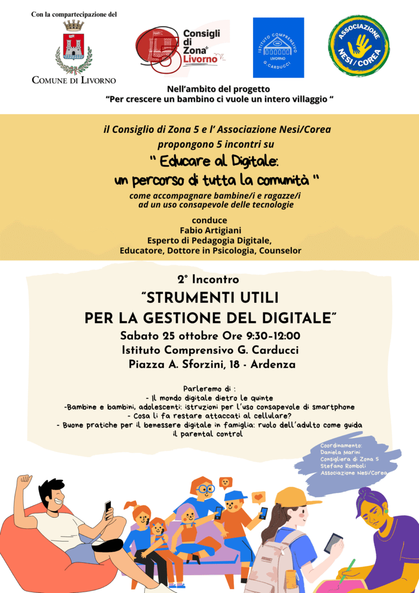 Prosegue il percorso “Educare al Digitale: un percorso di tutta la comunità”, promosso dal Consiglio di Zona 5 in collaborazione con l’Associazione Nesi/Corea, nell’ambito del progetto “Per crescere un bambino ci vuole un intero villaggio” e con la compartecipazione del Comune di Livorno.