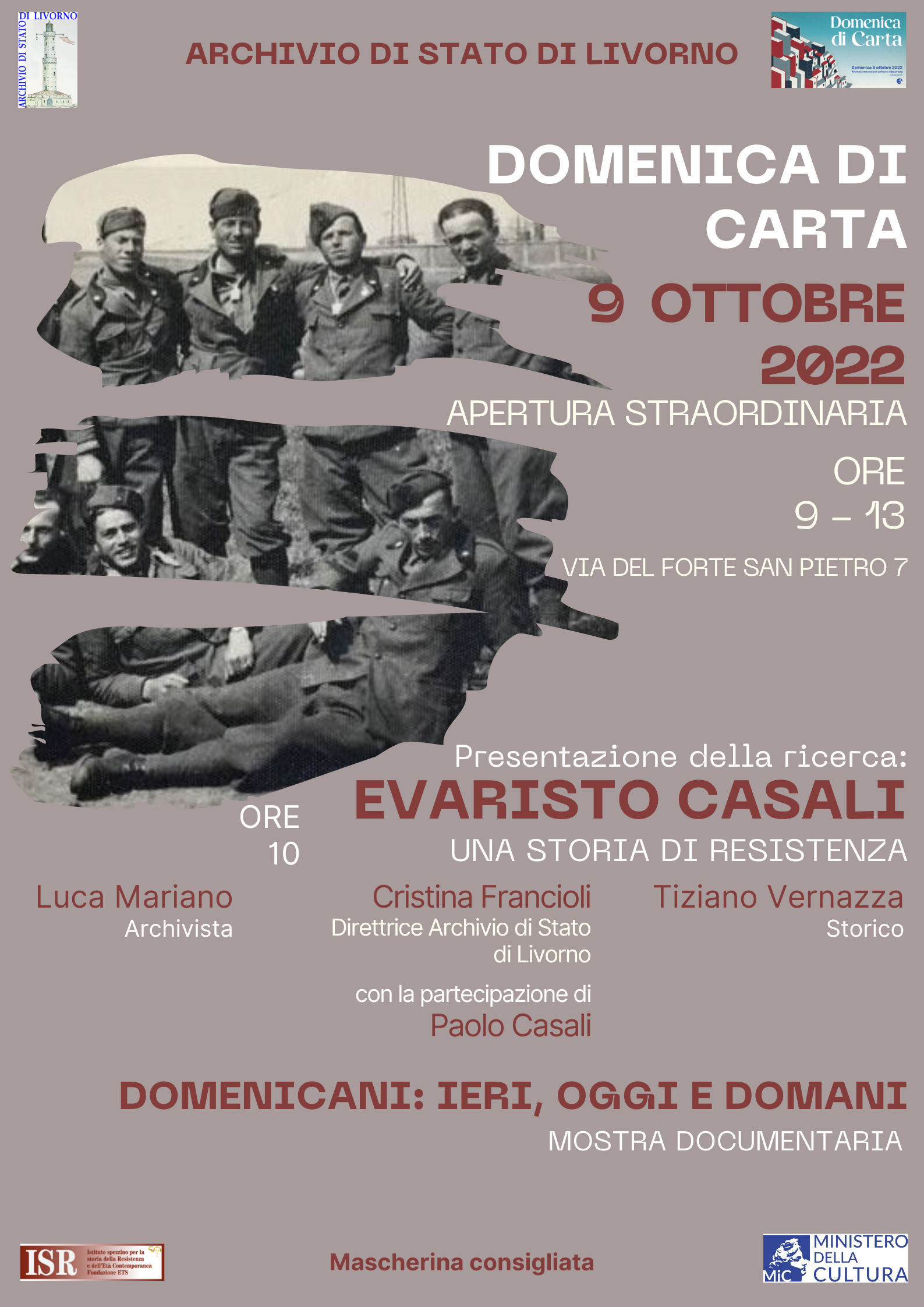 L’Archivio di Stato di Livorno aderisce all’Evento nazionale “Domenica di Carta 2022” con un’apertura straordinaria, domenica 9 ottobre 2022, dalle ore 9 alle ore 13, della propria sede aggiuntiva, sita nell’ex convento ed ex carcere dei Domenicani, in occasione della quale sarà possibile assistere alla presentazione della ricerca relativa ad Evaristo Casali, internato militare italiano (I.M.I) del territorio spezzino. Lo studio, svolto dallo storico Tiziano Vernazza e dall’archivista Luca Mariano, collaboratore presso l’Archivio di Stato di Livorno, verte sulle vicende del militare Evaristo Casali, di stanza per un periodo a Livorno e catturato dai tedeschi a Trento in seguito all’armistizio dell’8 settembre.
