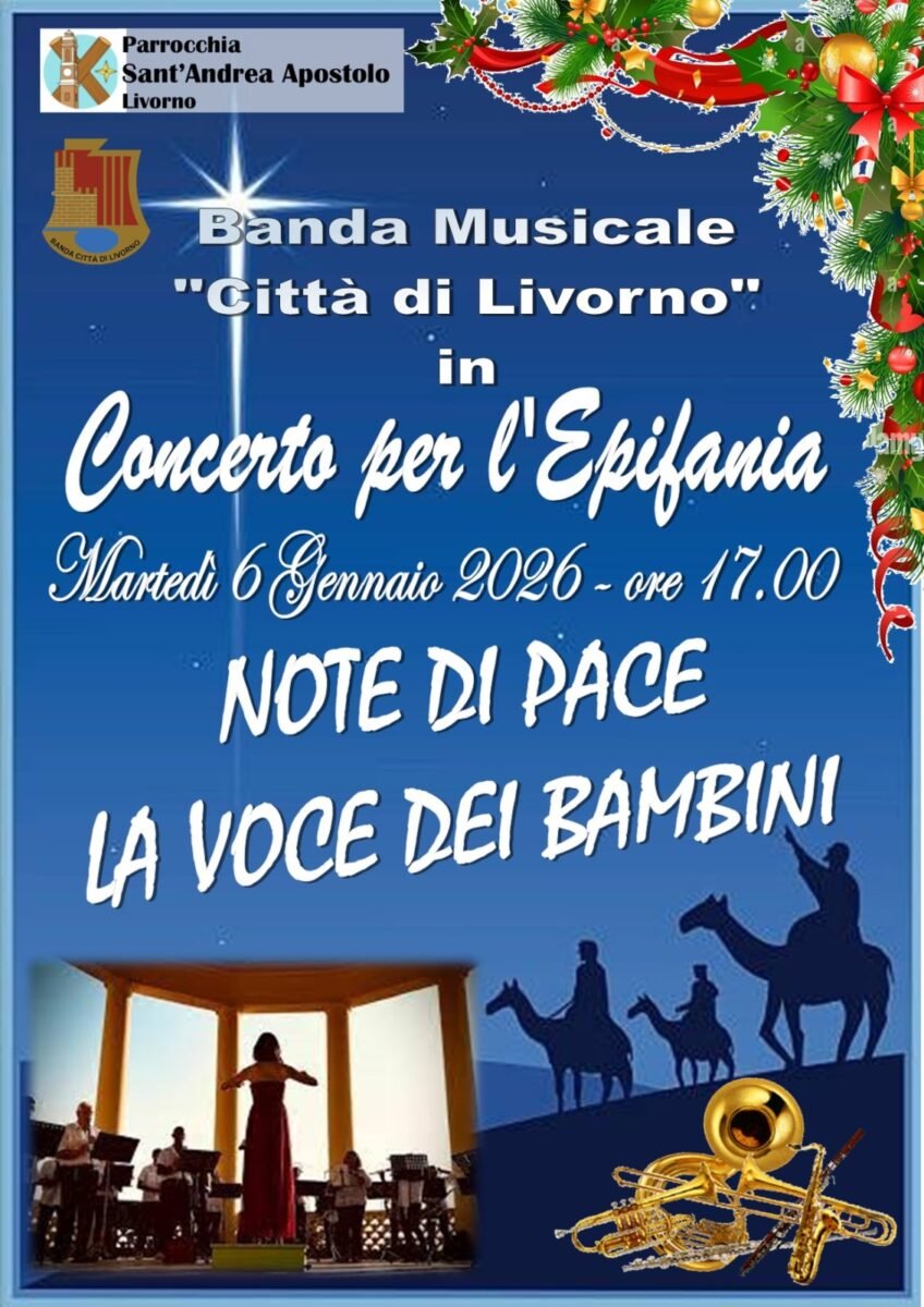 “Cari amici,siamo felici di invitarVi al Concerto dell’Epifania “Note di Pace”, che la Banda Città di Livorno avrà il piacere di offrire alla comunità parrocchiale di Sant’Andrea, su gentile invito di Don Rosario.L’appuntamento è per martedì 6 gennaio 2026 alle ore 17:00, presso la Parrocchia di Sant’Andrea. Sarà un pomeriggio di musica e condivisione per festeggiare insieme l’Epifania e concludere in armonia il periodo delle festività.
