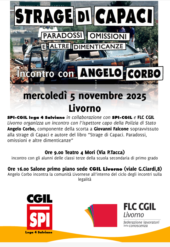 L’ispettore capo della Polizia di Stato in quiescenza Angelo Corbo, componente della scorta a Giovanni Falcone sopravvissuto alla strage di Capaci, prenderà parte a due iniziative a Livorno e Rosignano per parlare delle incongruità e dei misteri relativi alle indagini sull’attentato mafioso del 23 maggio 1992. Le iniziative – allestite all’interno del ciclo di incontri dedicati alla legalità – sono organizzate dallo Spi-Cgil lega 4 e Spi-Cgil lega 7 in collaborazione con Spi-Cgil Livorno e Flc-Cgil Livorno.