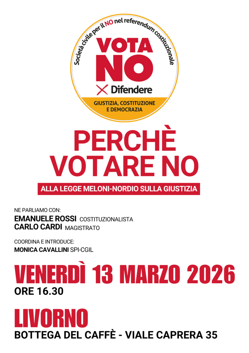 Venerdì 13 marzo alle ore 16.30 a Livorno presso la Bottega del caffè in viale Caprera 35 si terrà il dibattito “Perchè votare No alla legge Meloni-Nordio sulla Giustizia”.