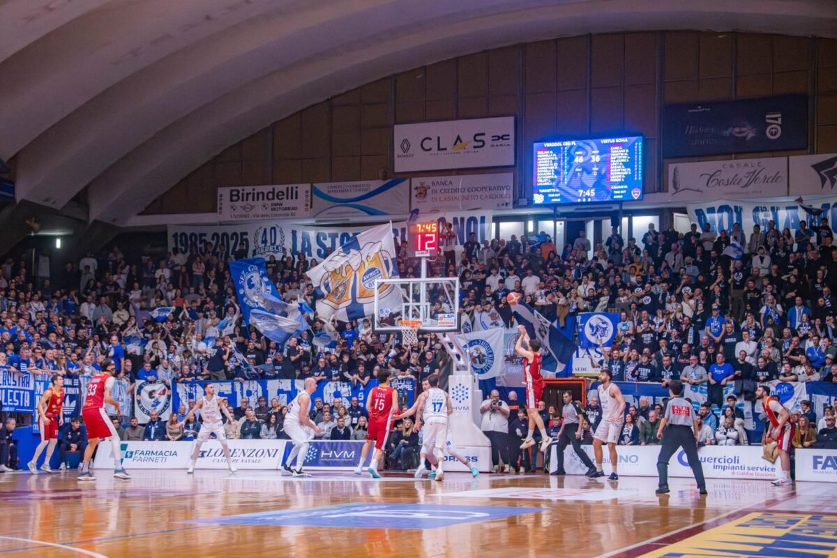 Che partita. Venucci, Alibegovic, Mennella, un crepitare di triple, Pielle a più 14 ma con i lunghi con 4 falli e Leonzio play. Roma non molla, cerca di picchiare dietro e guadagnare falli e tiri liberi. Tensione, e tifo alle stelle: quanto spinge il Palamacchia. Virtus a meno 7, sciocchezza di Rodriguez su tiro da tre di Venucci, e tecnico a Calvani. Quattro liberi in successione, 76-65. Ma non è finita: Rodriguez, giustiziere dell’andata, mette sette punti in un amen, e Roma è a meno 5 a 1’08” dalla fine. Non si smette mai di soffrire. Succede di tutto: Ebeling recupera una palla al platino e va in lunetta a 33 secondi dalla fine. Zero su due, ma Donzelli stoppa Rodriguez, Fallo su Gabrovsek che infila il primo, s’infortuna, il secondo tocca a Lucarelli: 78-73. E finisce 81-75 con la sciarpata e i tremila in estasi. Il sogno è realtà.